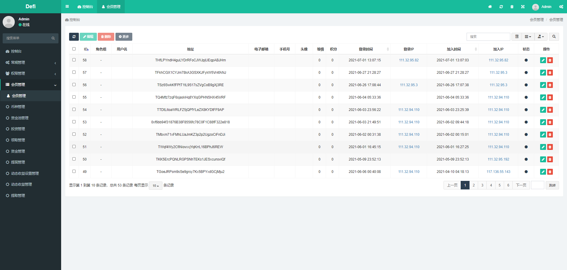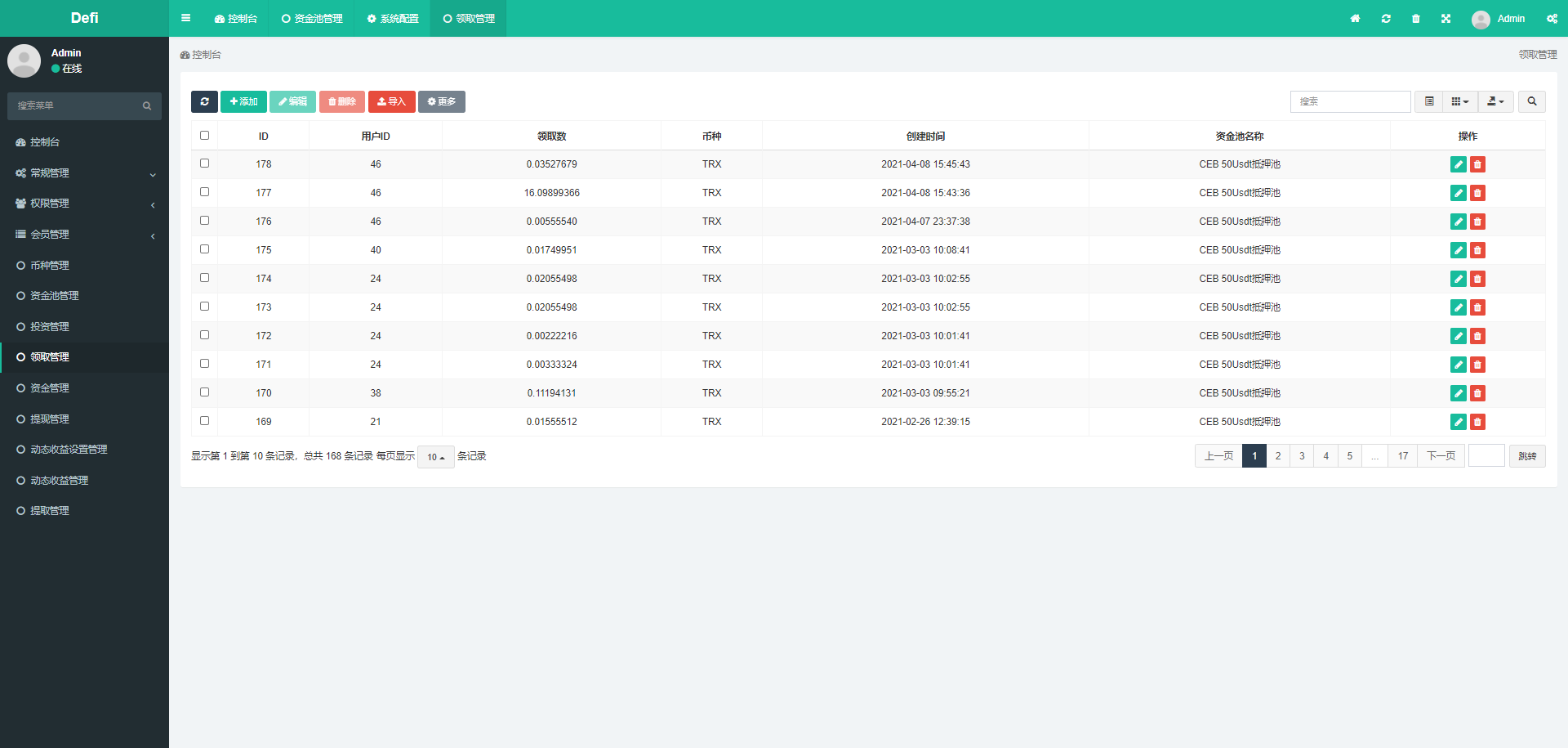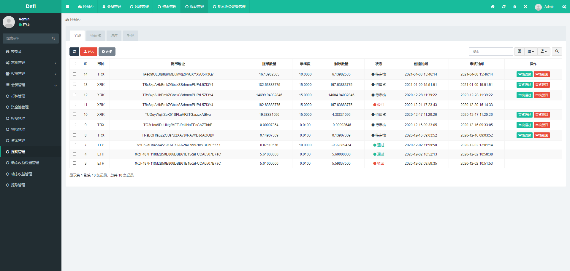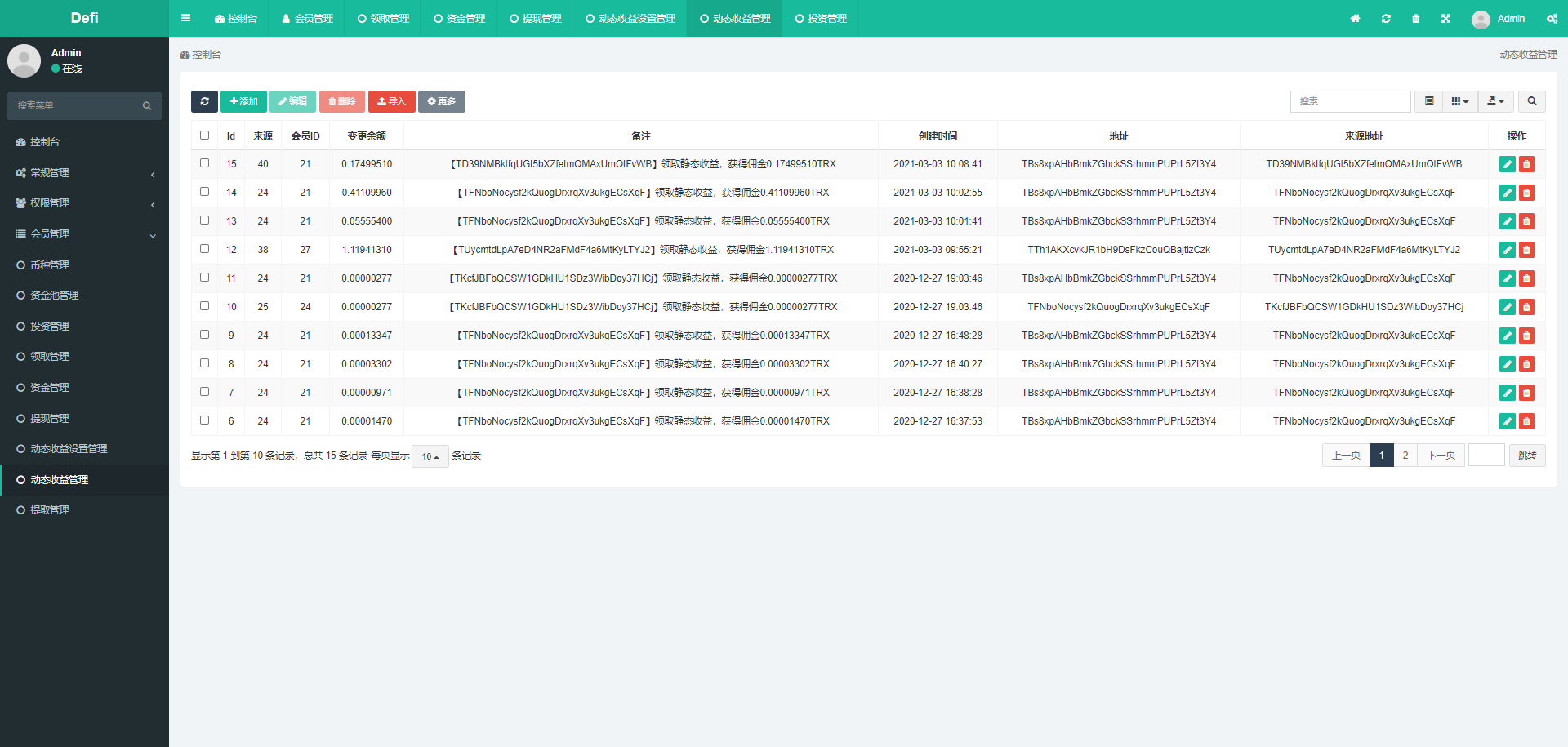 后台可以设定质押天数、收益、转入币种、转入数量(转入数量是固定的,比如设定10个TRX,那么用户必须投资10TRX进来。