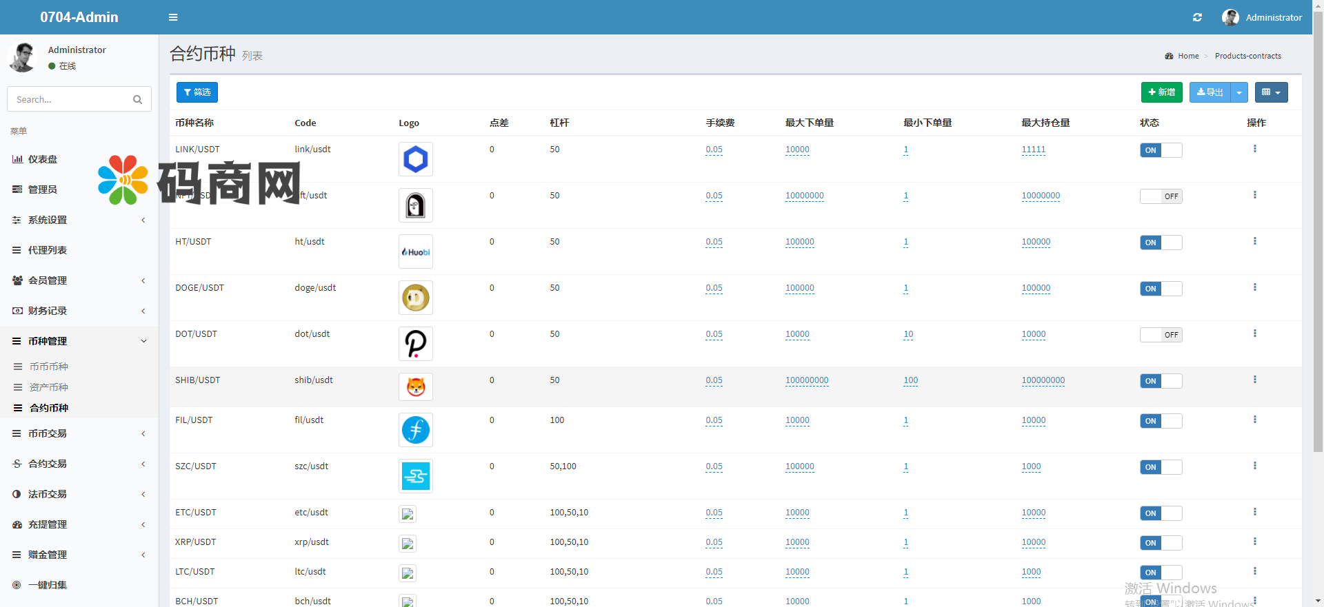 币种管理(币种的添加设置、提币账户管理、杠杆倍数、是否显示、交易对管理,资产币种、合约币种、币币币种);