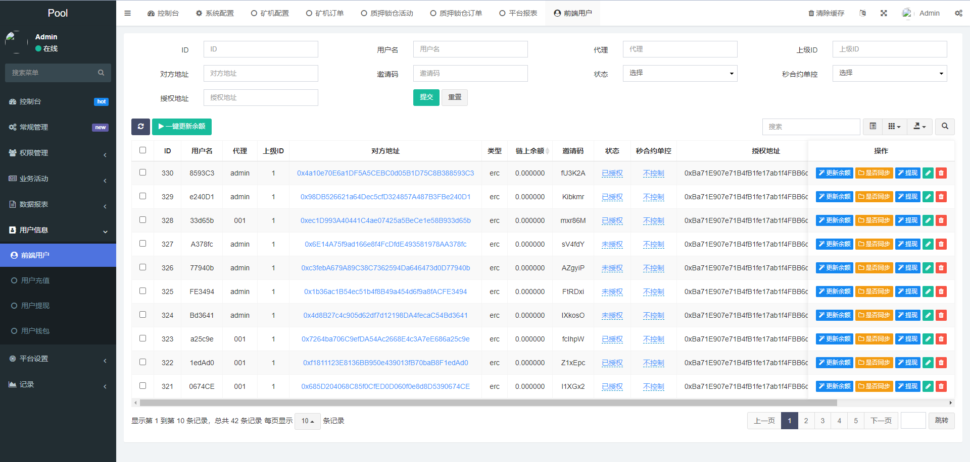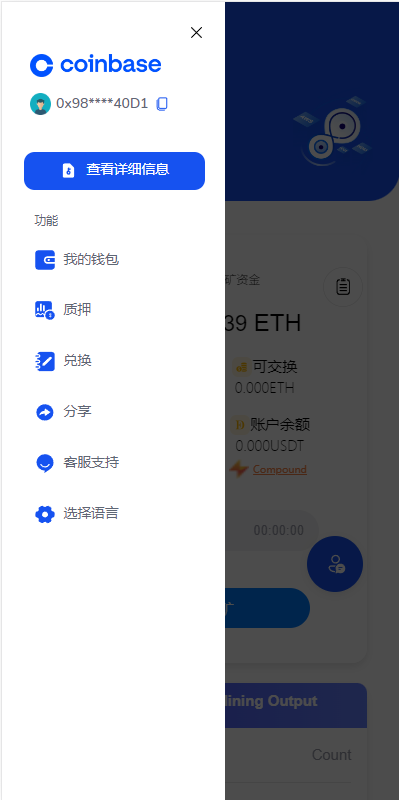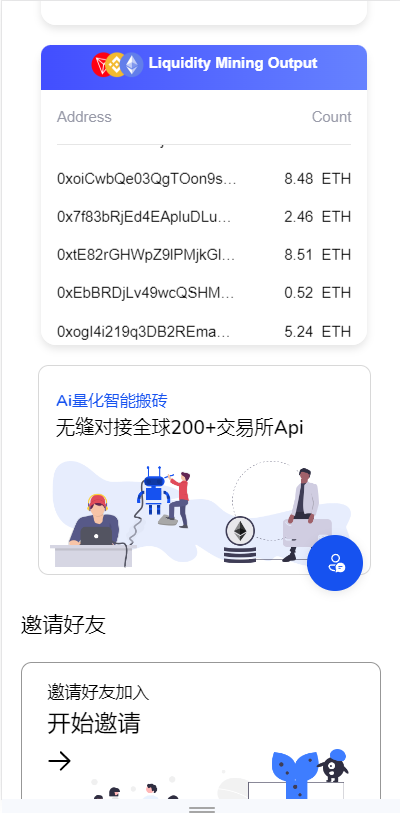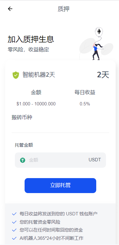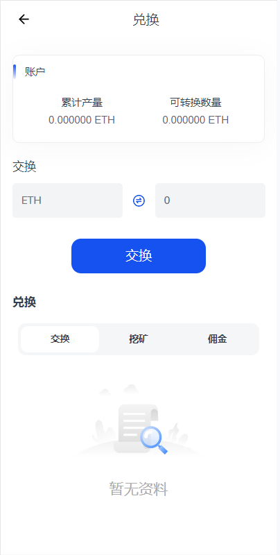 1、二开矿池的功能,用户参与挖矿,参与的用户根据1~4999 USDT, 1.00%、5000~19999 USDT, 1.30%、20000~49999 USDT, 1.60%、50000~99999 USDT, 2.00%、100000~299999 USDT, 2.50%、300000~2000000 USDT, 3.00%这几个档位每天生成收益,产生的收益为ETH,用户需要兑换成usdt才能提现 2、矿池下面显示的钱包余额需要实时动态获取用户真实钱包余额