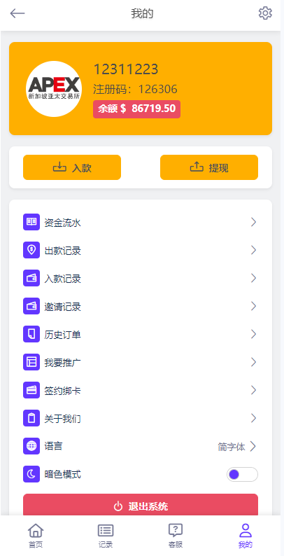 系统交易产品以外汇为主K线正常、提现限制、金额一键冻结等功能