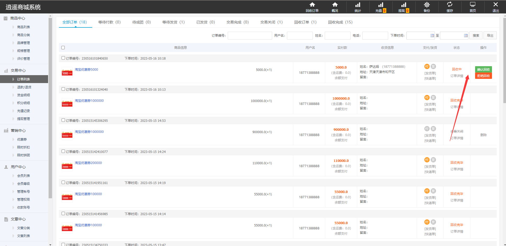 回收系统直接集成系统不需要二开搭建,前台提交后台订单直接回收,新增功能每个商品可设置回收折扣