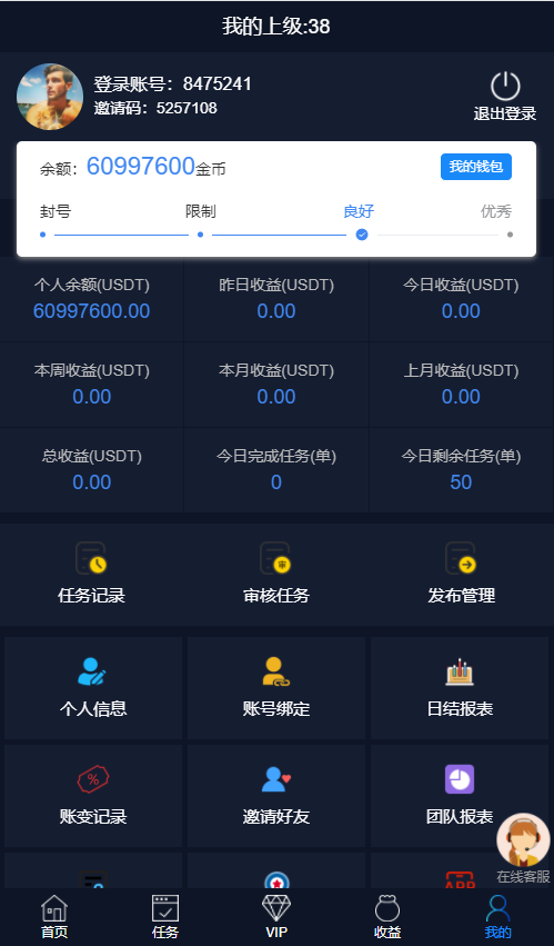 前台:首页可领取脸书tiktok等点赞关注任务!任务等级分为七种,每种等级领取的任务数量各不同。三级分销,没级代理各不同。可查看个人信誉度。