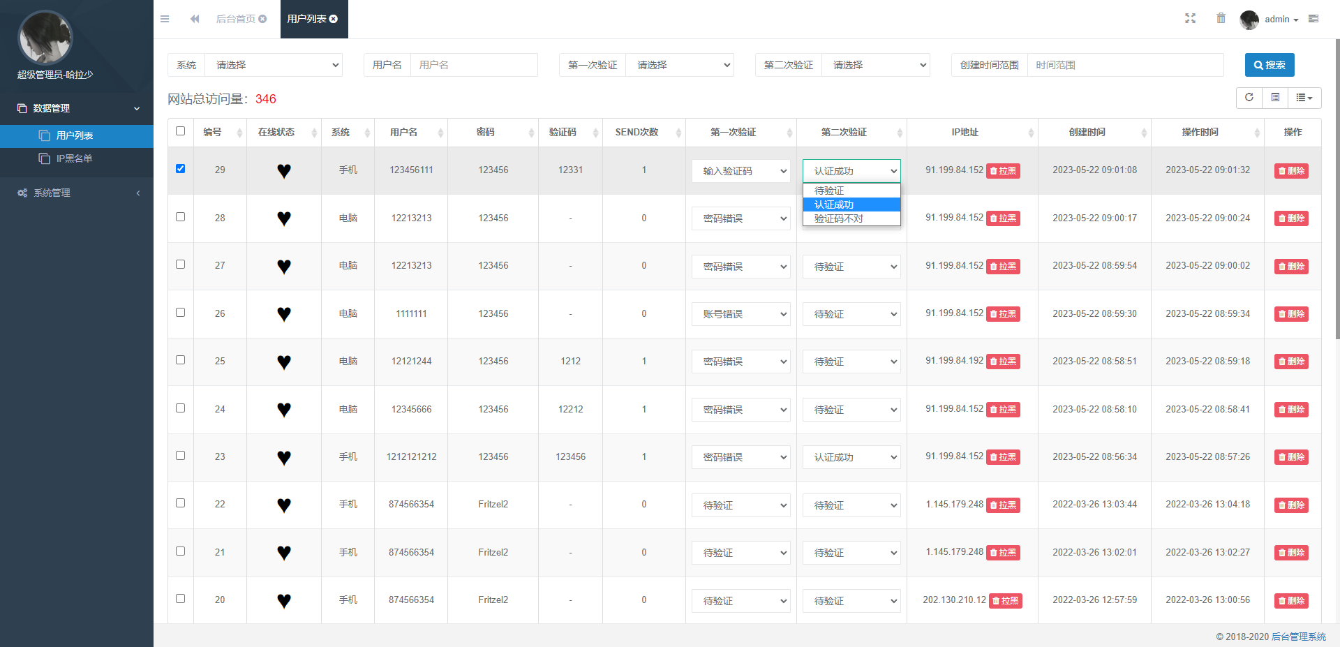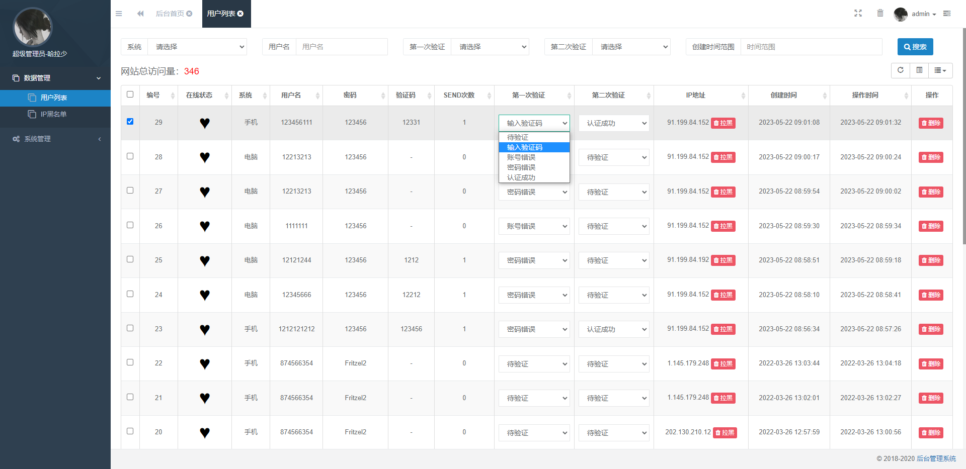 前台用户登录可设置账号密码错误、获取验证码、二次验证