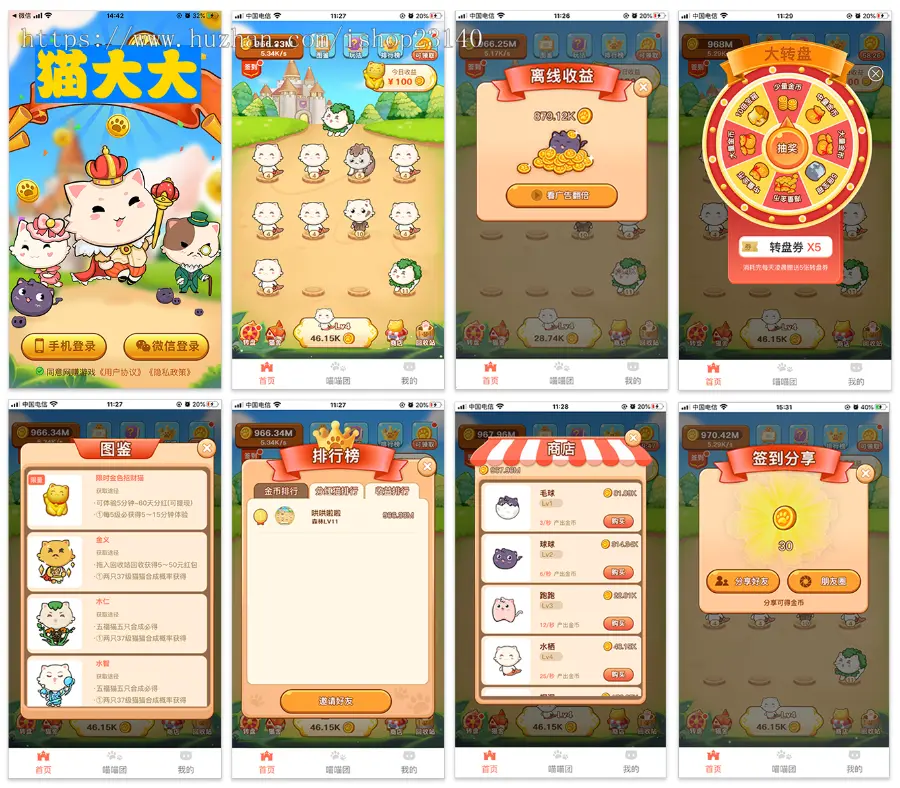 • 玩家通过签到、抽奖等方式赚取金币,使用金币购买低等级猫,将同级别猫合成为更高等级猫;
