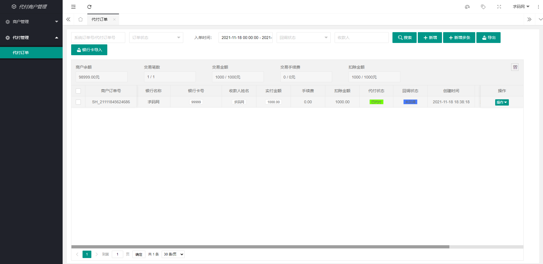 2、支持银行卡手动代付