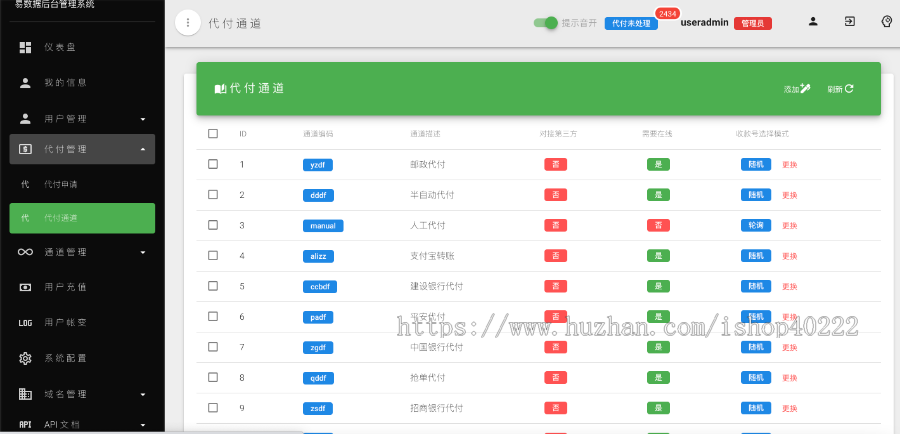 4、后台:后台可以随意添加删除通道、上游类型、账号、轮训规则等,使您的使用灵活配置;