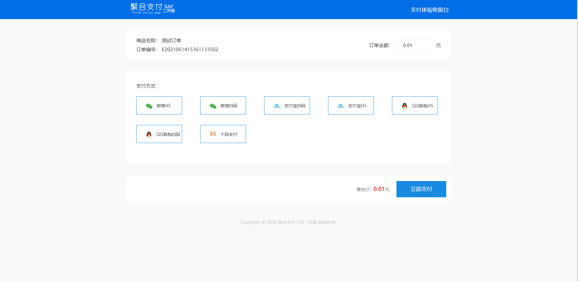 修复bug,三网通道正常支付:微信NATIVE扫码、微信公众号支付/微信jsapi、微信H5;支付宝当面付、支付宝PC、支付宝手机h5、QQ扫码、QQh5。