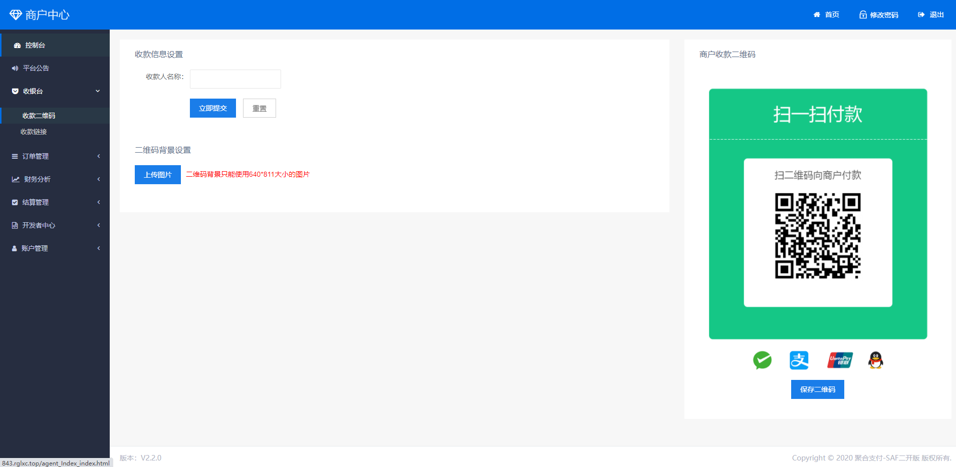 商户中心:收银台(收款二维码+收款链接)、订单管理、结算申请、结算记录、商户代付、代付记录、财务分析、商户认证