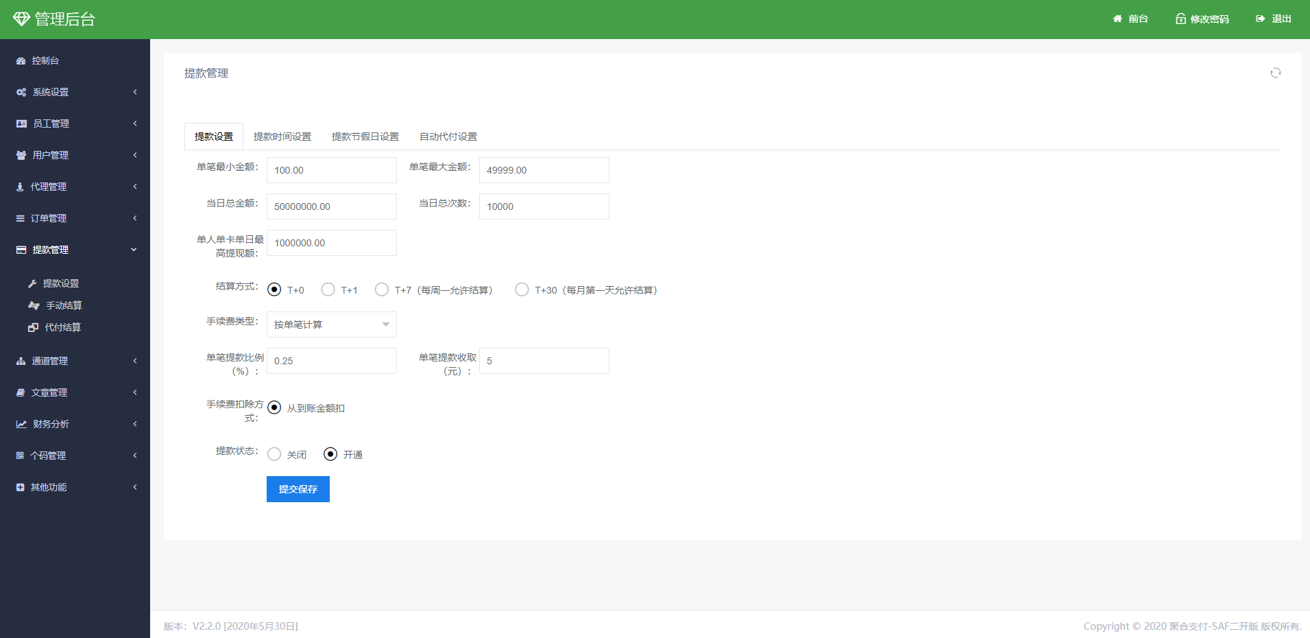邀请码注册(可选)、D0/T1多种结算方式、商户代付结算、谷歌令牌验证