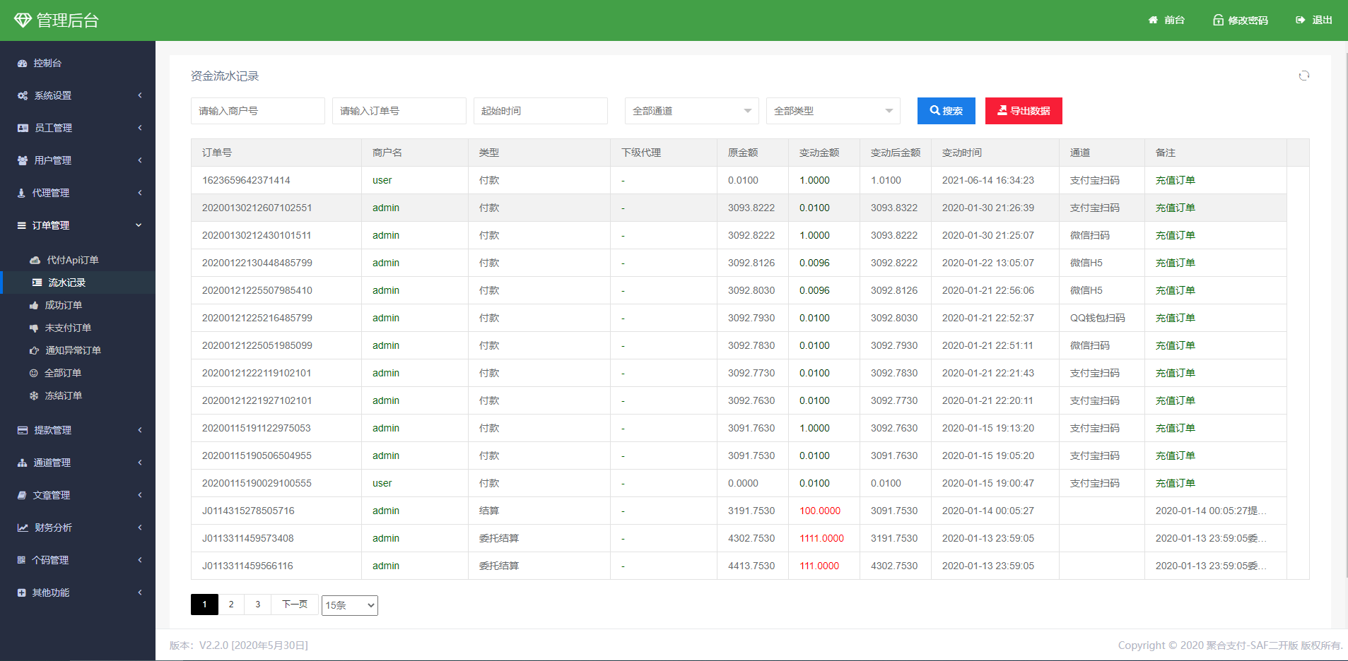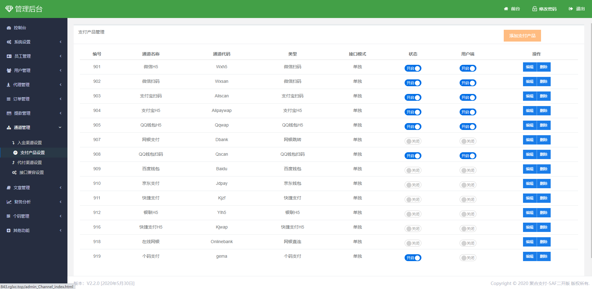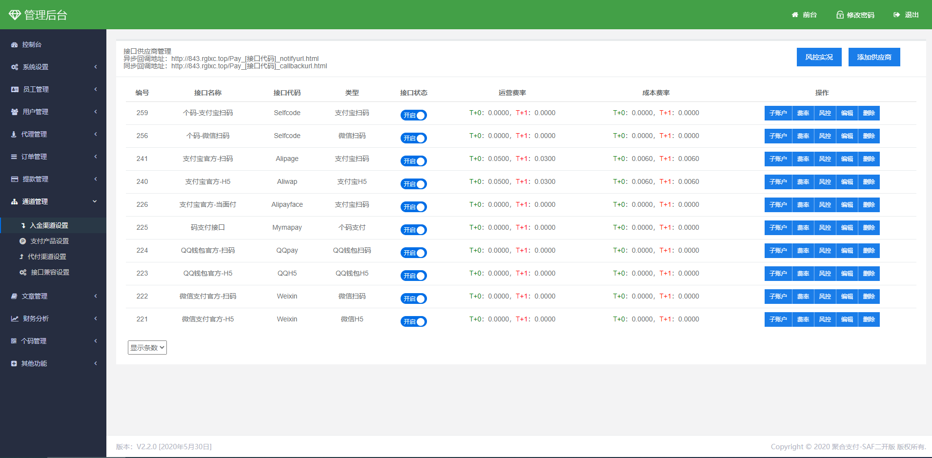 管理后台:风控设置、邮件设置、短信设置、计划任务、数据清理、菜单管理、用户分类管理、员工账号管理、权限配置、用户管理、投诉保证金设置、代理管理、代理佣金记录、订单管理、重新通知、手动补单、手动结算、代付结算、支付产品、入金通道、代付渠道、易支付接口兼容、文章/公告管理、财务分析、个码管理(订单语音通知+手动确认回调)、网站模版、提现语音通知、异常订单排查、手动订单系统等等