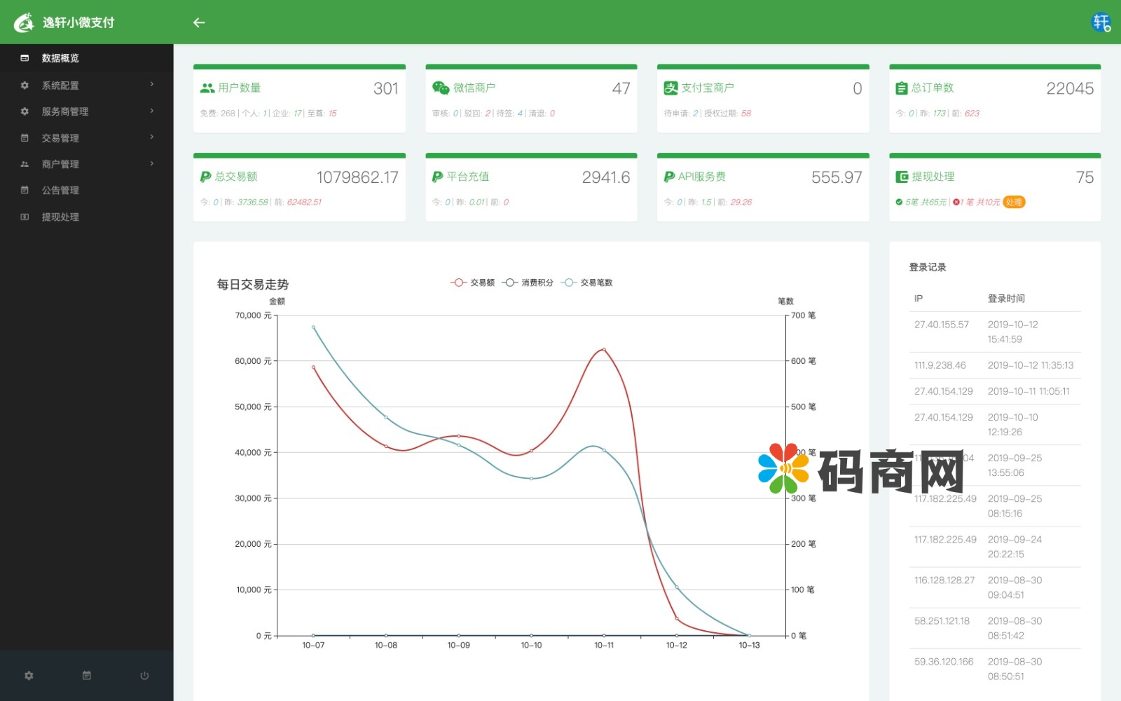 管理后台:数据统计+系统设置+服务商添加/上线/下线/排序+费率/套餐设置+用户管理/商户管理+订单管理+公告/文章+积分/邀请明细+提现处理