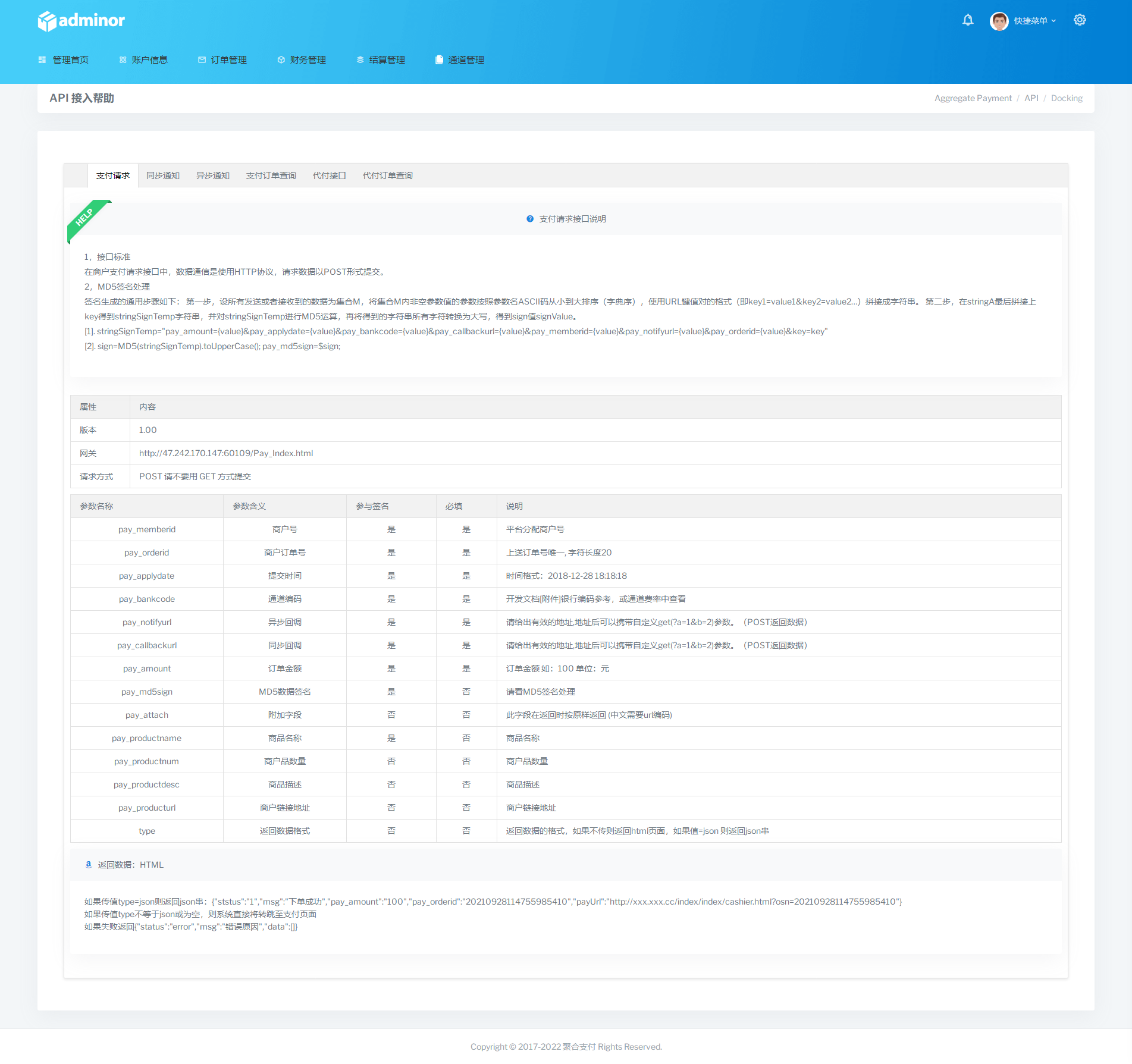 - 文档优化,对接文档重写,现在的文档更加清晰明了,之前是form表单提交的文档,由于现在市场基本上都是需要返回json串的,所以过去的方式已经不太适用,文档已经修改,技术员在对接上游通道时,必须要按照统一格式来对接。