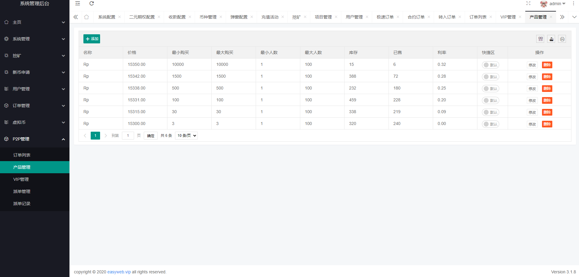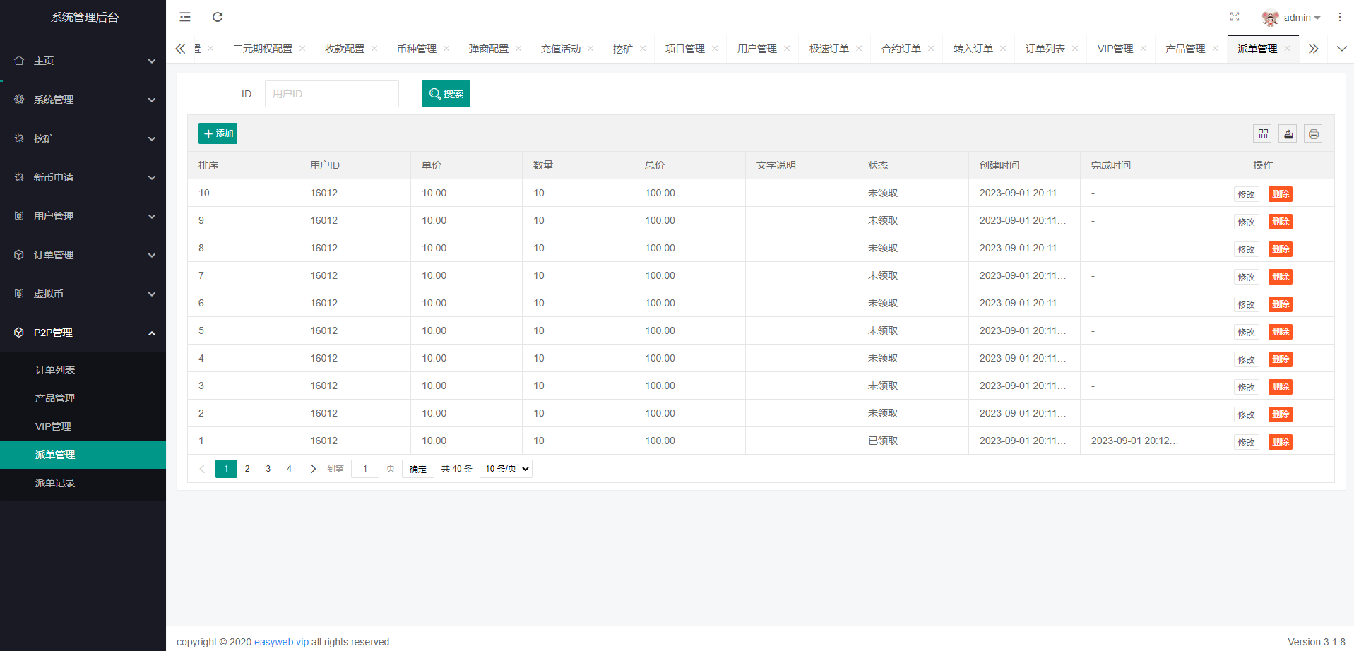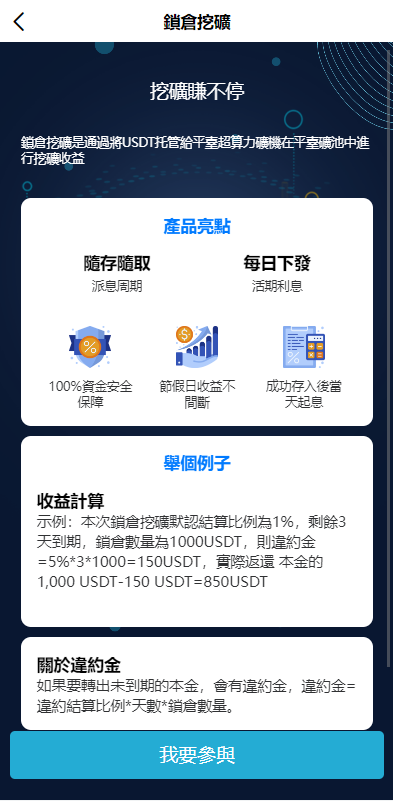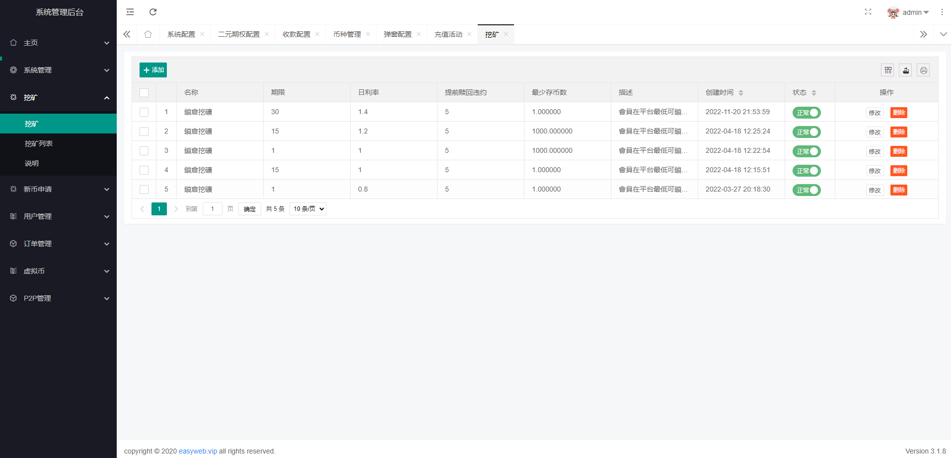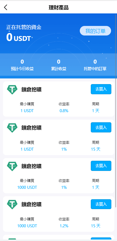 系统新增p2p理财功能、派单抢单功能,支持锁仓质押、三级分销、下单限制等功能
