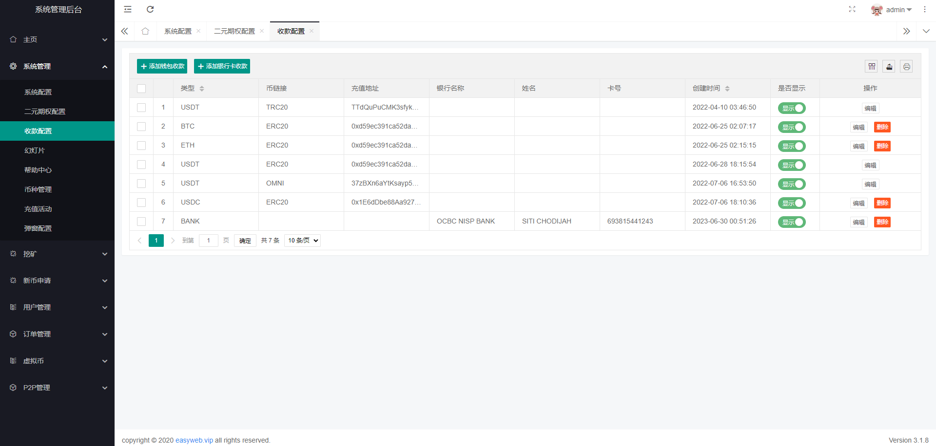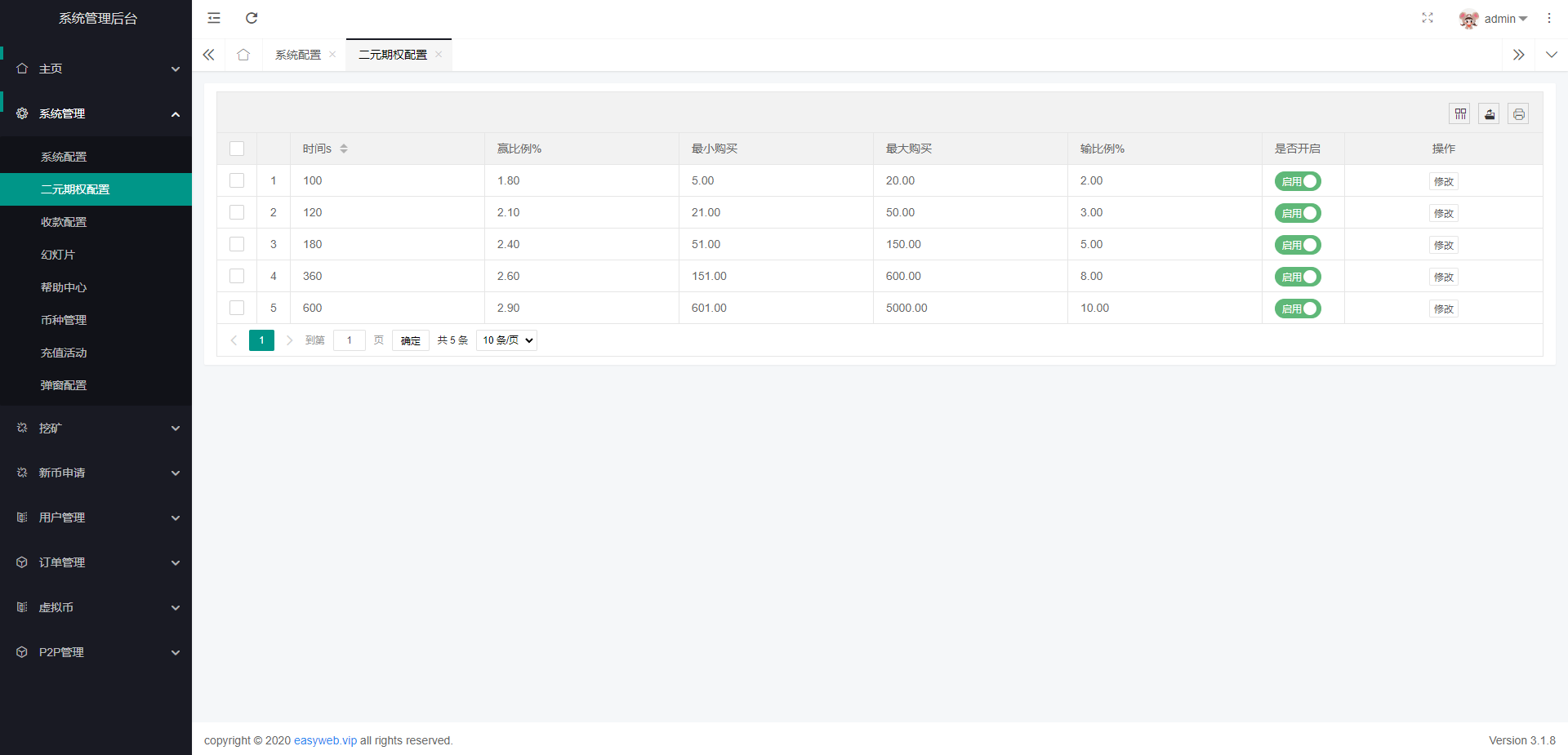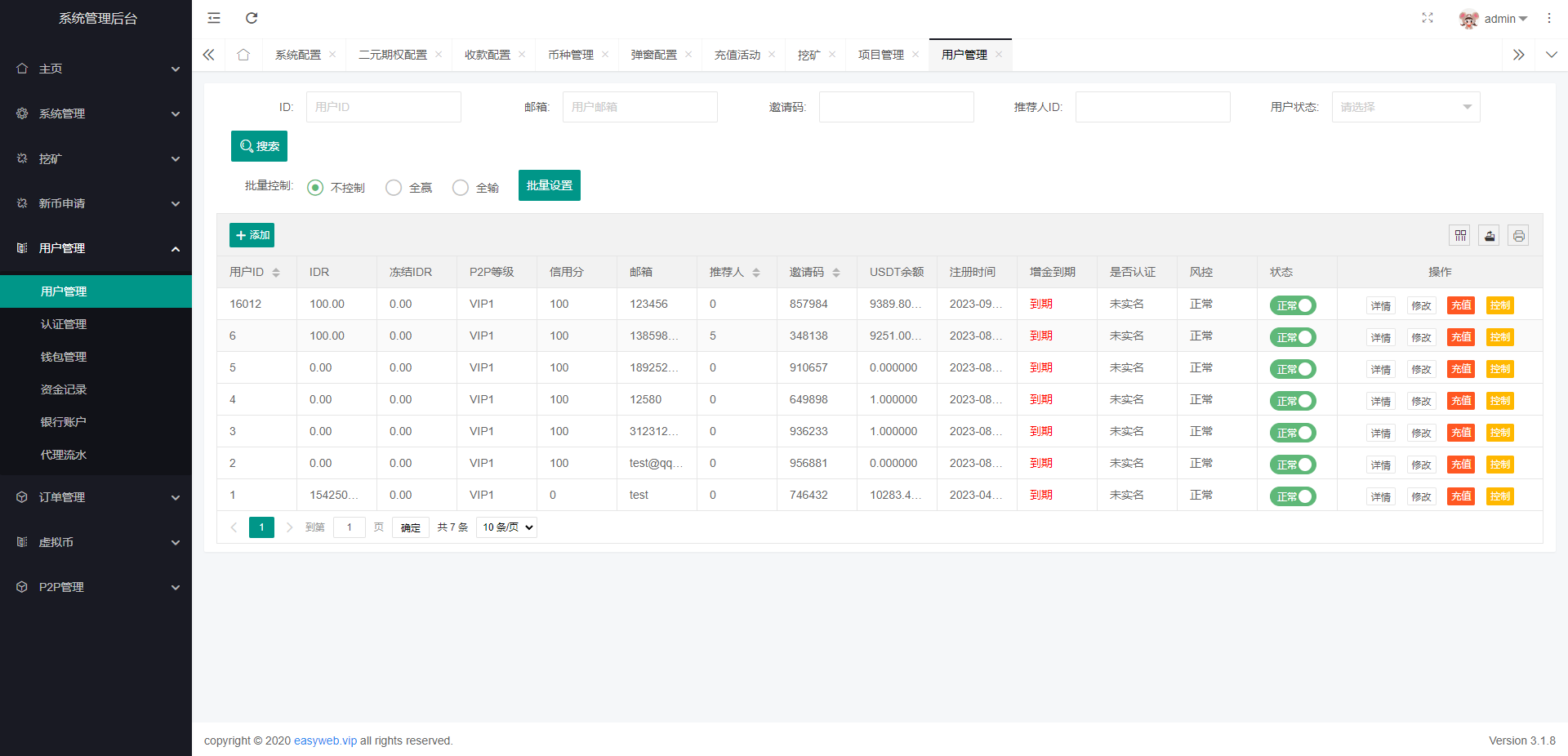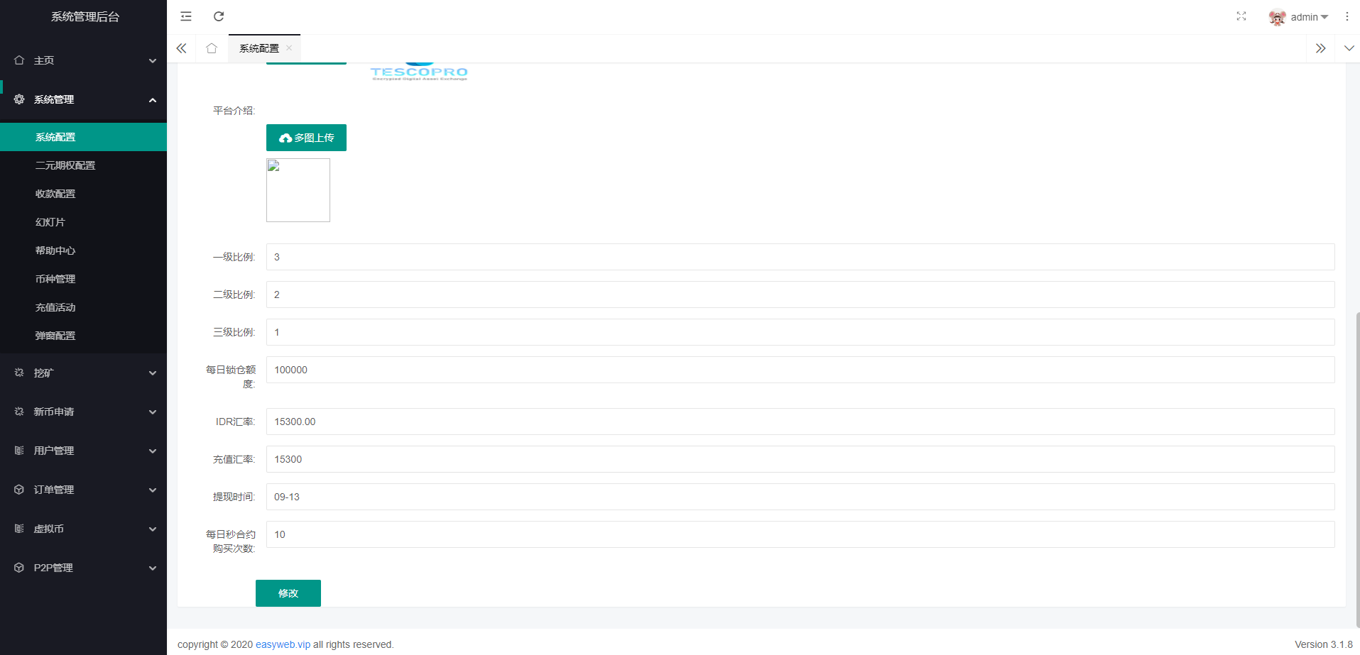 系统新增p2p理财功能、派单抢单功能,支持锁仓质押、三级分销、下单限制等功能